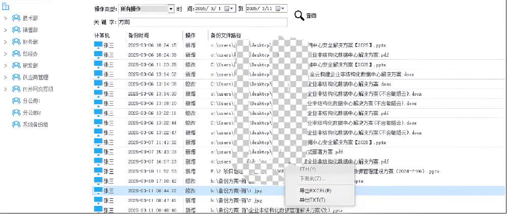 备份文件路径还可以按照关键字进行模糊查询,日志报表导出、文件